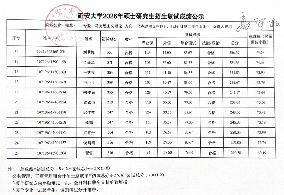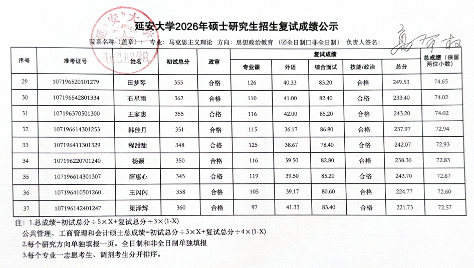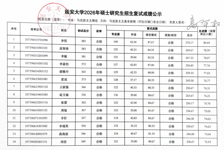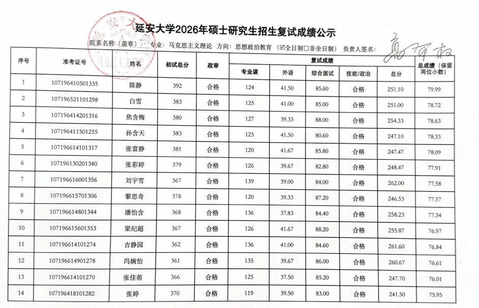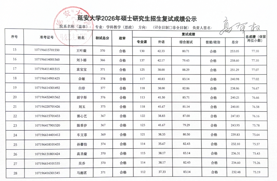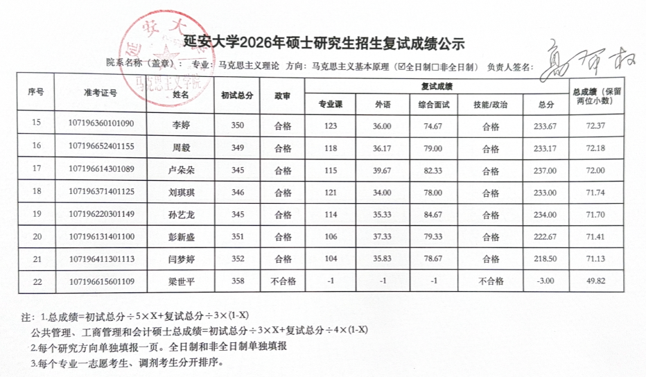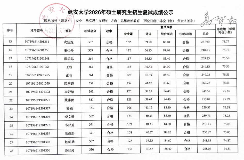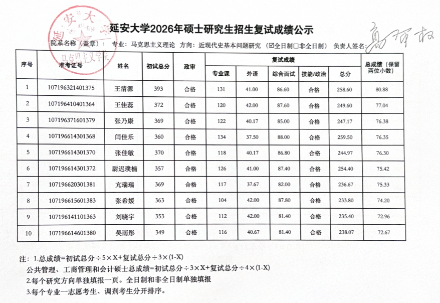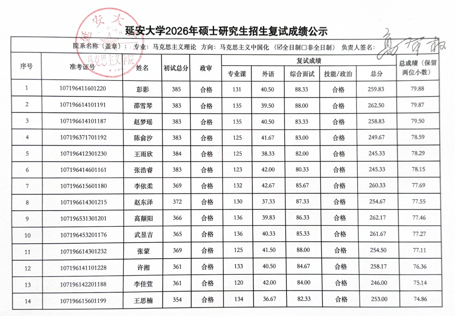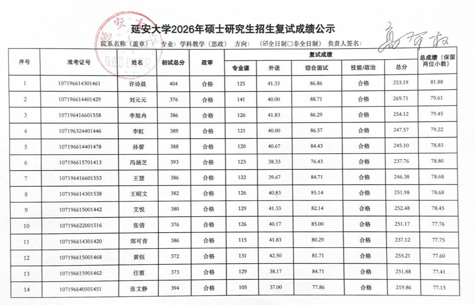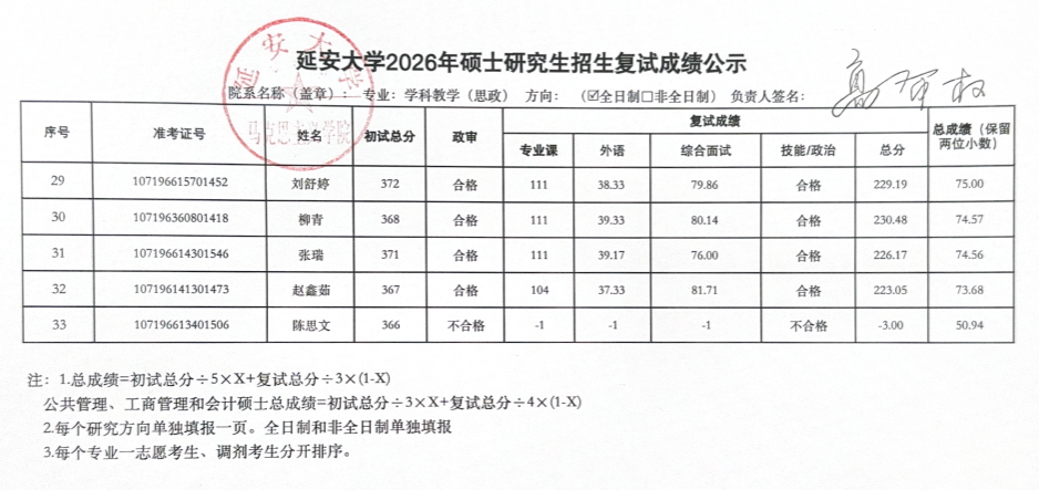 2026年硕士研究生复试工作实施方案,3月29日至3月31日的一志愿考生复试工作已圆满结束。现将具体复试成绩予以公示(名单中出现“不合格”和负分情况为缺考标识),公示时间为十个工作日,于公示期间如有疑议,请联系: