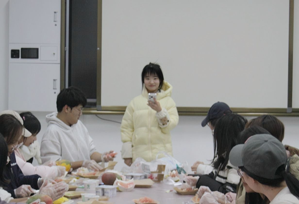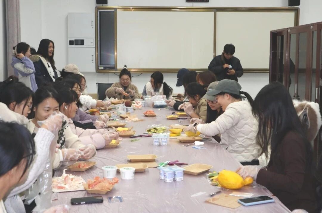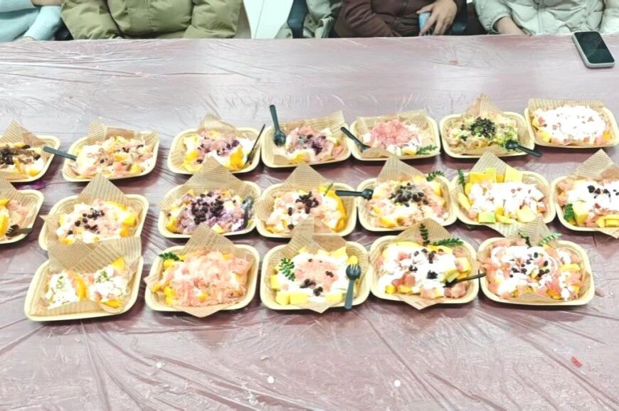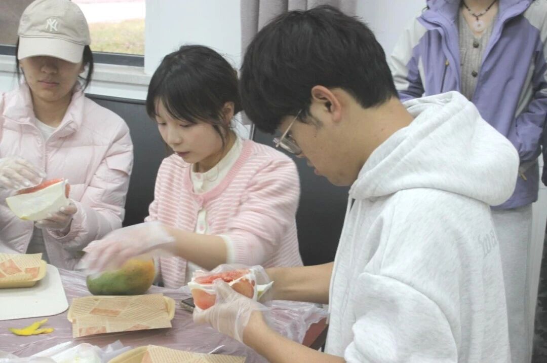 同学们通过“水果标签”互动,用芒果的活力、西柚的清新、酸奶的醇厚等特质趣味自我介绍,迅速消解陌生感。随后进入“感官唤醒”正念练习,参与者闭目触摸果实纹理、轻嗅天然果香,从课业压力中抽离,回归当下感知。核心环节“匠心制作”中,同学们分组协作,铺酸奶、切芒果、撒西柚,以可可粉绘制个性化图案,创作出独一无二的固体杨枝甘露,在动手实践中体会专注与协作的力量。“我的甜品故事”分享会将活动推向高潮,同学们展示作品、讲述灵感,有人从分层设计中感悟生活层次,有人感慨“专注制作的30分钟竟忘了手机”,有人在协作中找到默契。苗玉园在总结指出,将抽象情绪转化为可触可感的实体作品,正是心理疗愈的生动实践,一碗碗色彩缤纷的甜品,成为自我对话的仪式与情感流动的载体,让“心理疗愈”从概念变为手中温暖的现实。