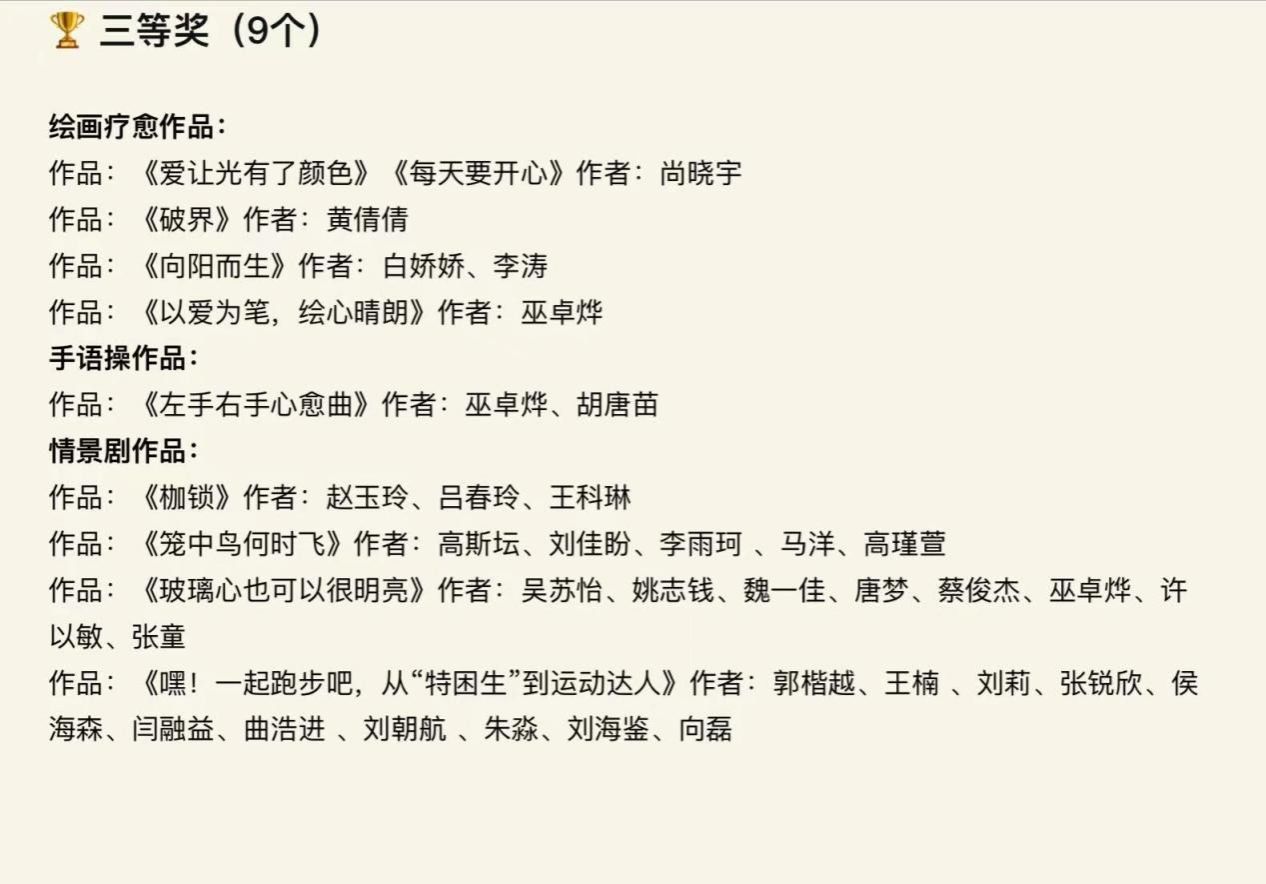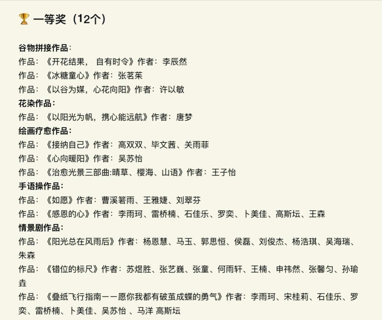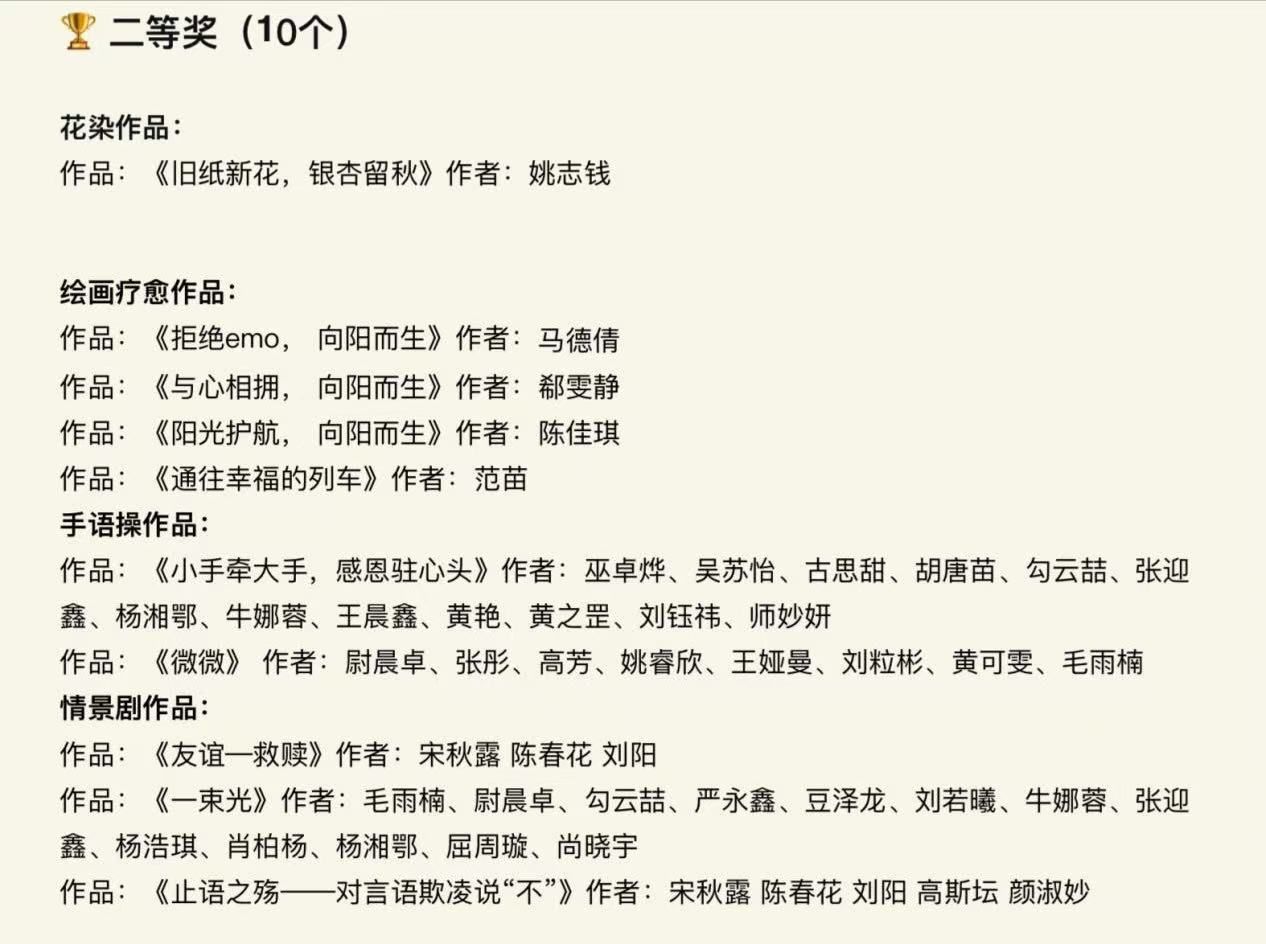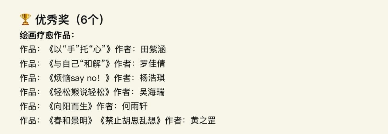 将秉持“心理育人,润物无声”理念,持续创新载体、深化内涵,致力于培养德智体美劳全面发展、人格健全的时代新人,为立德树人注入心理动能。期待下一次活动中,见证更多同学以作品传心声、以创意绽芳华!