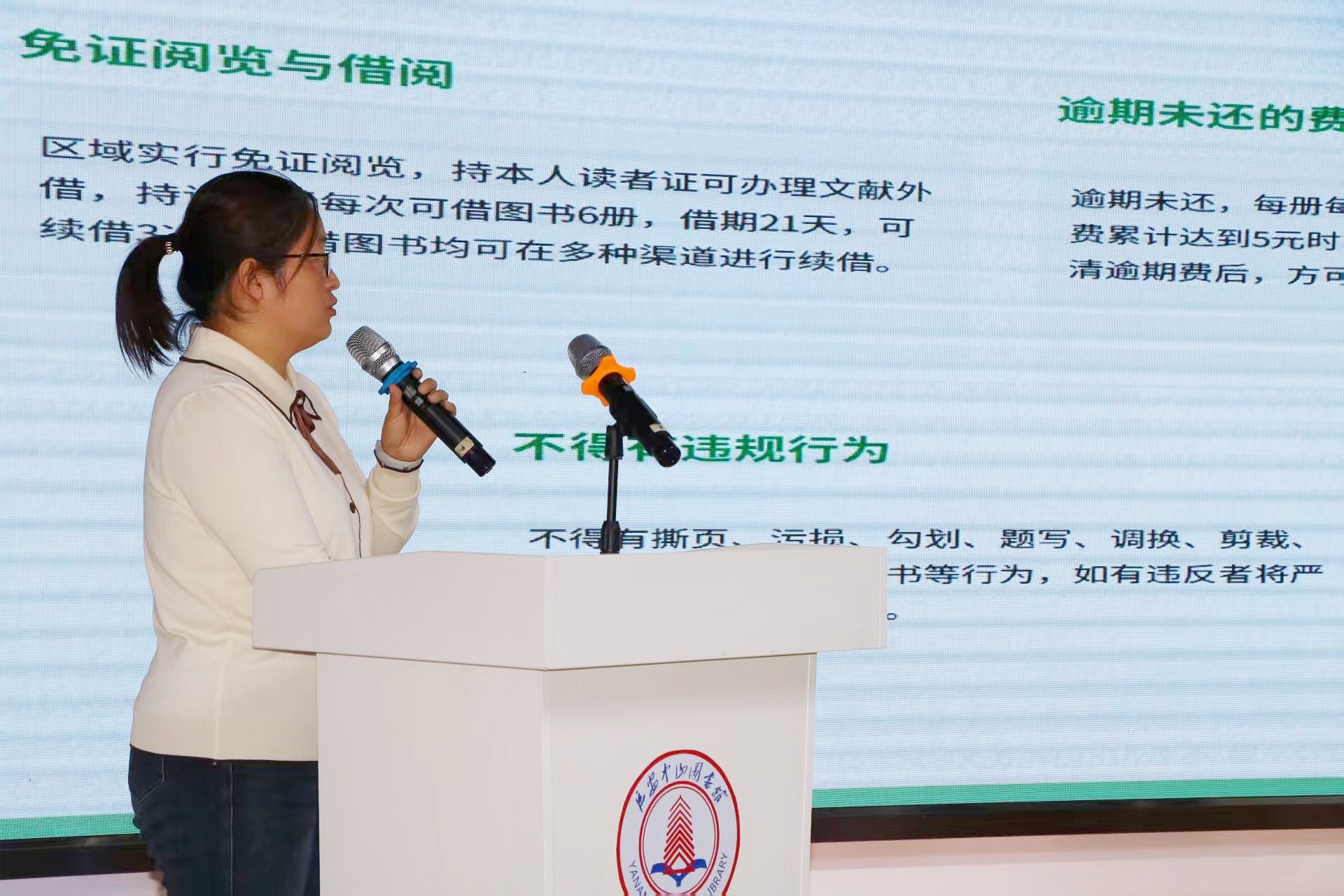在互动环节,延安市图书馆文献部徐彩丽老师系统介绍了馆藏资源、借阅规则及线上平台使用方式。最后,全体成员在刘海鉴同学领读下,共同宣读《经典阅读倡议书》,承诺以终身阅读深耕经典,助力文化建设。此外,活动还同步启动了“志愿服务”“经典接力”线上共读与“经典重现”短视频征集等延伸活动,持续推动阅读推广常态化、多样化、有效化。