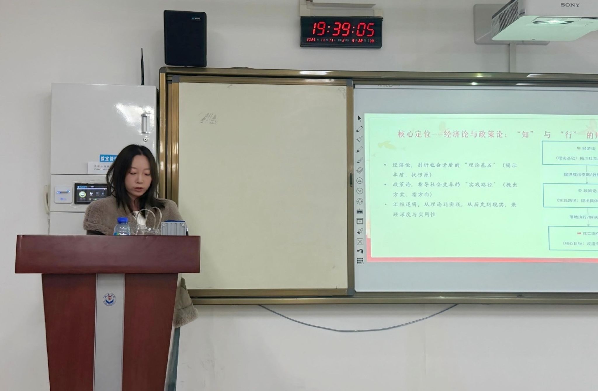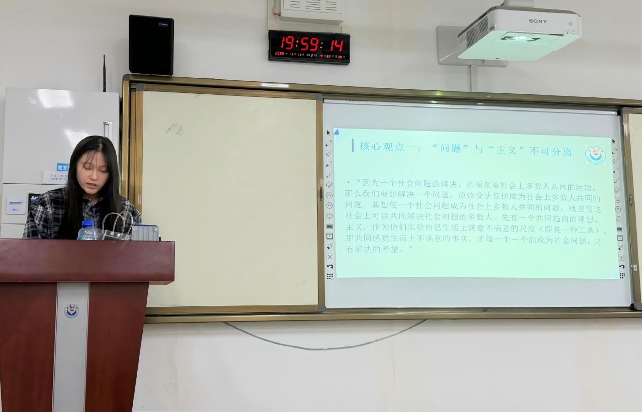 罗阿丽的汇报围绕《我的马克思主义观》的上篇展开。她提出,在这部分李大钊主要介绍马克思主义理论体系构成。李大钊提出马克思主义理论分历史论、经济论、政策论三部分,阶级斗争是串联三部分的关键。马乐主要围绕《我的马克思主义观》的下篇展开。下篇核心议题是马克思主义的革命路径,即在经济论基础上,强调则以阶级斗争为核心,通过革命推翻资本主义,实现生产资料公有,进而确立社会主义制度。夏铭阳一重点解读了《再论问题与主义》的核心观点,如何平衡社会根本改造与具体问题解决的关系,进而强调要从问题与主义的辩论中汲取智慧,用于观察和思考当下的社会与发展,寻求主义与问题的辩证统一。