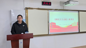 颉燕同学在读书会最后进行总结陈述。她充分肯定本次读书会的学习成效与两位同学的精心准备,同时强调《新民主主义论》中蕴含的实事求是、立足国情、守正创新的思想方法,即便在当下依然有着强大的理论指导力与现实意义。她勉励在场所有同学,以此次读书会为新的起点,持续深耕马克思主义经典著作,坚持读原著、学原文、悟原理,把理论学习的成果真正内化于心、外化于行,在学思践悟中坚定理想信念,在新时代新征程中主动担当作为。